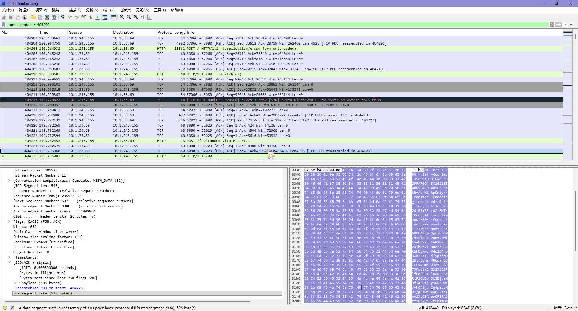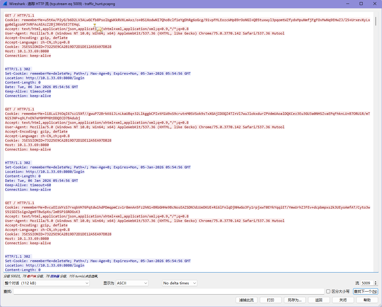$ tshark -n -r .\traffic_hunt.pcapng -T fields -Y "tcp.stream eq 5009" -e http.cookie >> cookie.txt