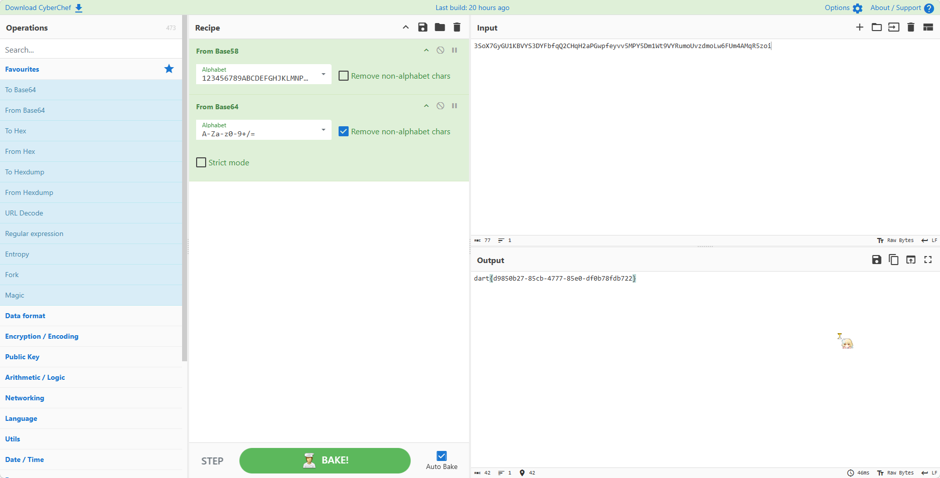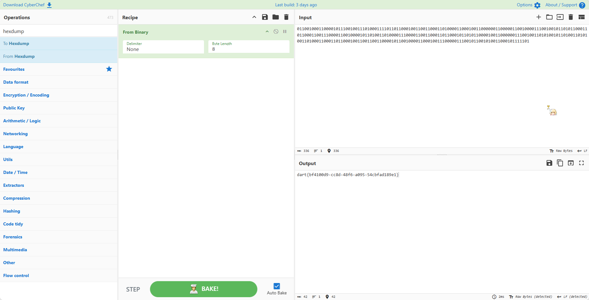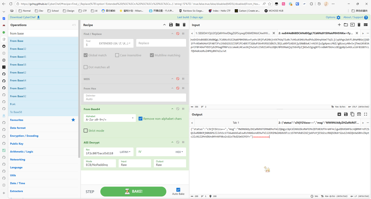 得到 011001000110000101110010011101000111101101100010011001100011010000110001001100000011000001100100001110010010110101100011011000110011100001100100001011010011010000111000011001100011011000101101011000010011000000111001001101010010110100110101001101000110001101100010011001100110000101100100001100010011100000111001011001010011000101111101,用赛博厨子