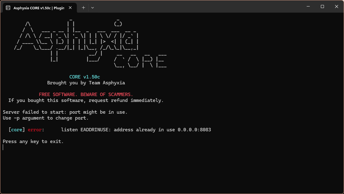 首先你要确保你的后台有一个Asphyxia Core正在运行,它应该是一个如图示一般的命令行窗口