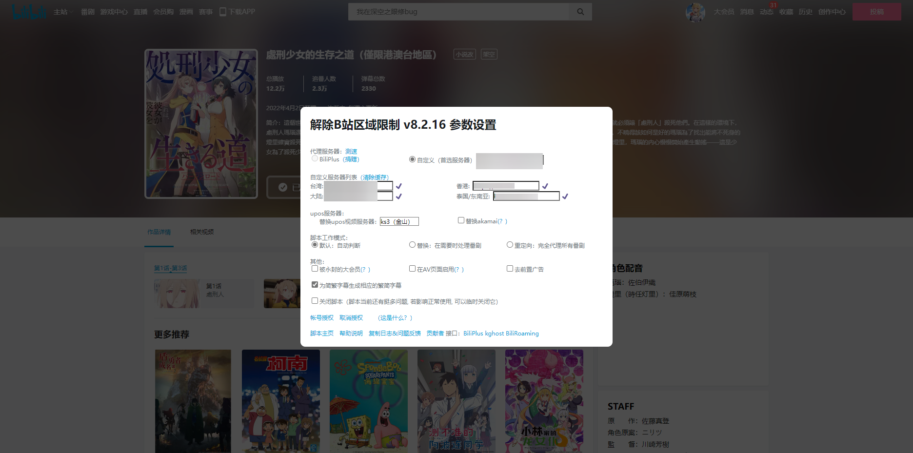 对于我这种追番老手来说,这可是不能接受的一件事情。而在我早期搜索B站港澳台的时候,发现了能够突破这种限制的油猴脚本bilibili-helper/README.md at user.js · ipcjs/bilibili-helper (github.com),以前这个脚本使用的是biliPlus的服务器,但是后来因为一封律师函,所以就只能自建服务器了(后面会说)